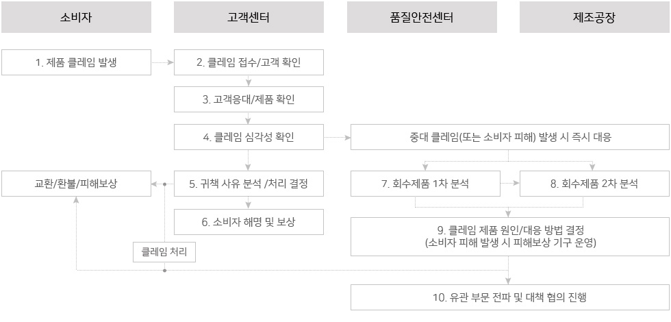 소비자의 목소리를 가장 먼저 듣는 접점 부서인 고객센터를 운영하여 고객 대응 절차에 따라 소비자의 불만, 의견, 아이디어 등을 다양한 채널로 접수하고 있습니다. 접수된 내용이 신속하게 처리, 반영될 수 있도록 사내 인트라넷을 통해 공유하며 실시간 조치될 수 있도록 하고 있습니다.
